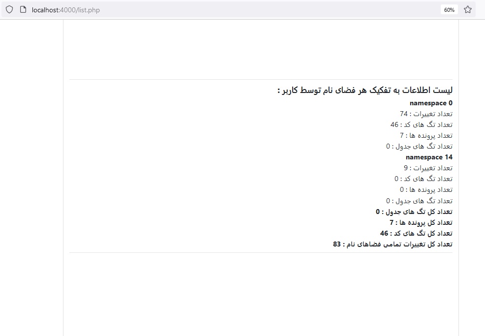 | ۴ خرداد ۱۴۰۱، ساعت ۲۰:۰۸ | خروجی رتبه بندی کاربران به ازای هر فضای نام.jpg (پرونده) | ۹۴ کیلوبایت | ۱ | ||